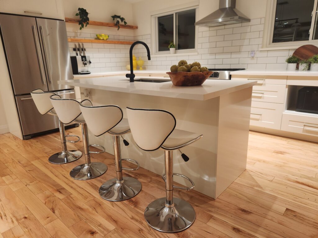 The open floor plan connects the kitchen, living room, and dining room, creating one continuous sightline. The finishes throughout—chrome, black accents, and clean architectural lines—set the tone. The living room furniture was white leather, so when I came across bar stools in white leather with black accents, it felt like fate. They were the exact visual bridge the space needed to tie the kitchen and living room together, completing the modern story.